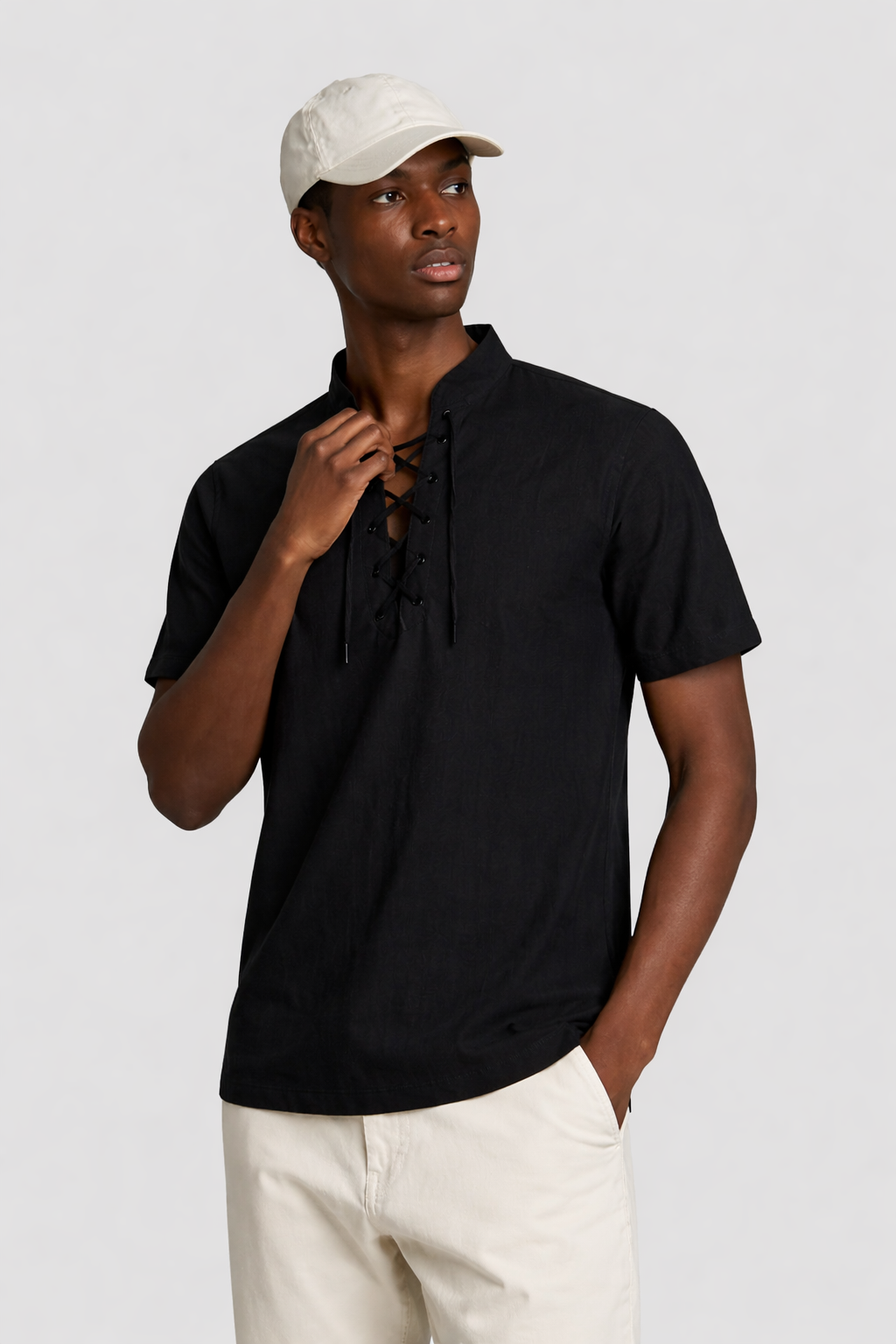 Crafted from a breathable cotton and linen blend, featuring a minimalist lace-up neckline that adds subtle character to a clean, modern silhouette.